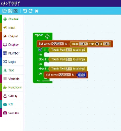 Tokymaker is programmed using a visual block-based coding environment similar to Google Blockly. Users can create logic-based programs by dragging and connecting blocks, making coding accessible for beginners. For advanced users, Tokymaker also supports JavaScript coding.